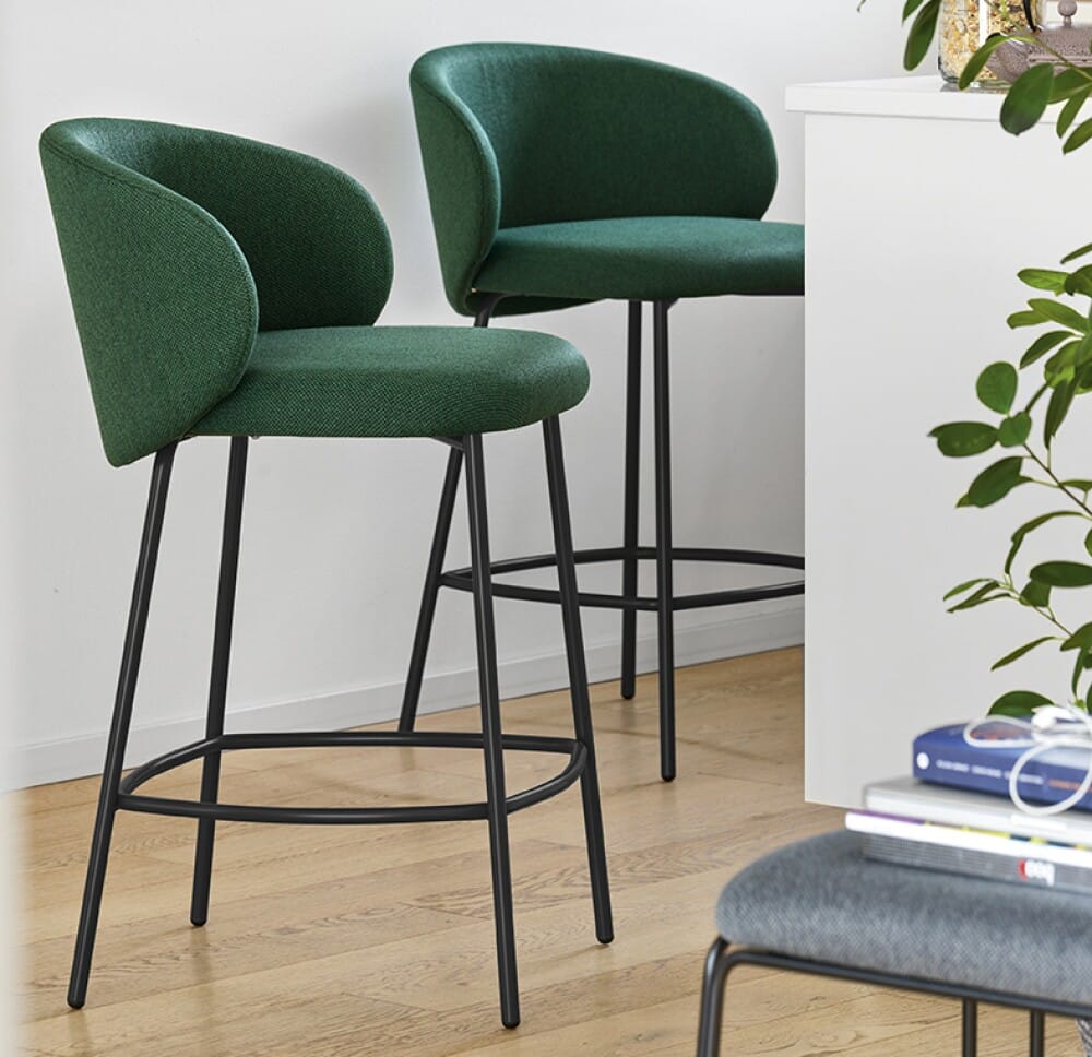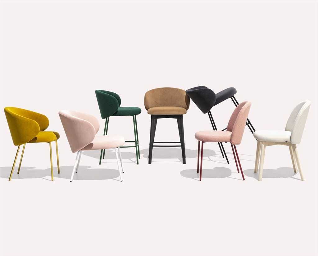 Sjedište i naslon tapecirani su u tkaninu prema velikom izboru materijala i boja, čime se stolica dodatno prilagođava estetskim i funkcionalnim zahtjevima projekta. Dostupna je i opcija baze s centralnom nogom s regulacijom visine, kao i drvena izvedba. Model omogućuje izvedbu s višim naslonom, bez rukonaslona, te izradu polubarske verzije. Dodatne opcije dostupne su na upit.