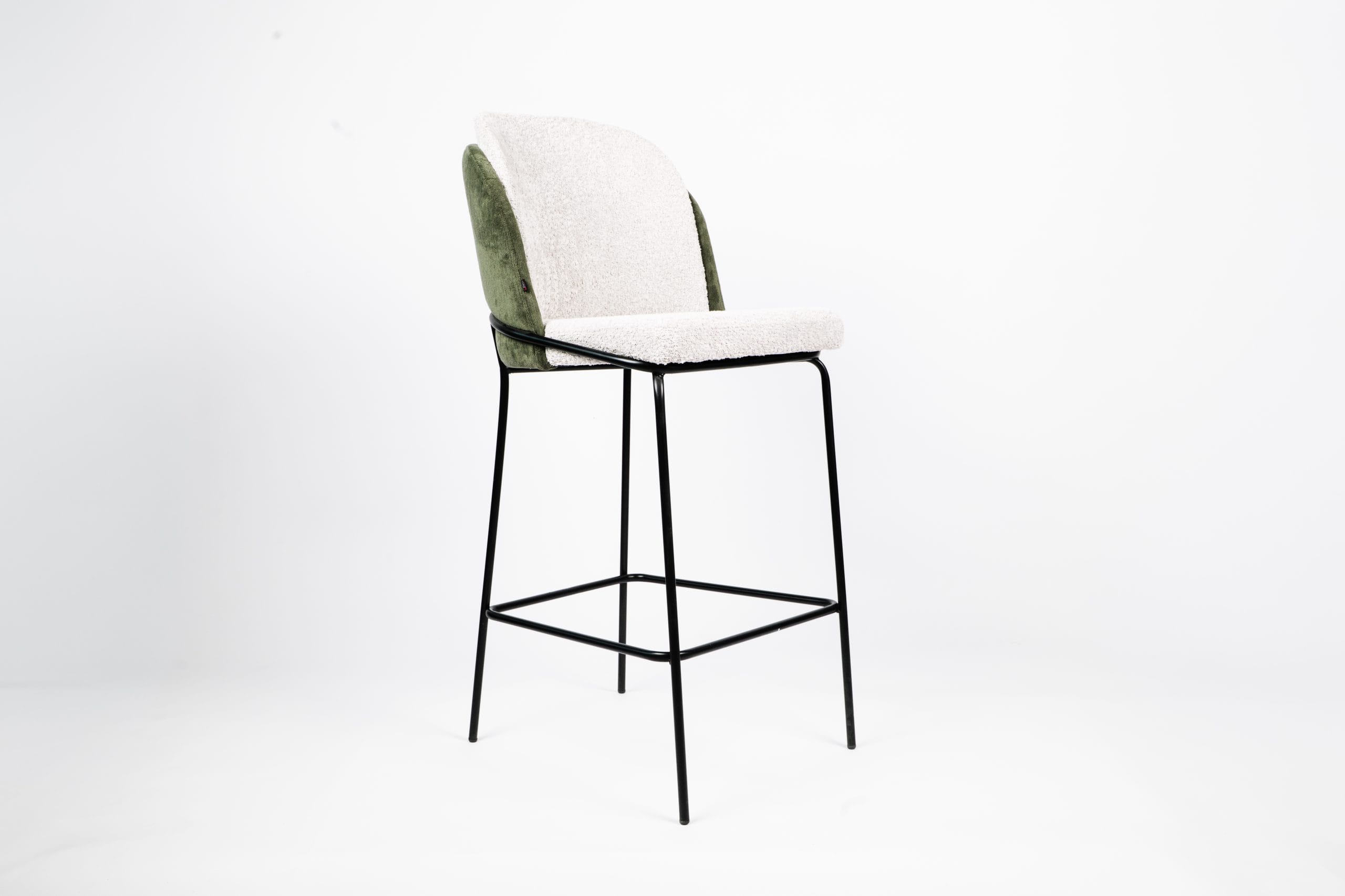 Tapecirana barska stolica s metalnom konstrukcijom, prilagodljiva izborom materijala i boja, idealna za ugostiteljstvo i kućne barove.