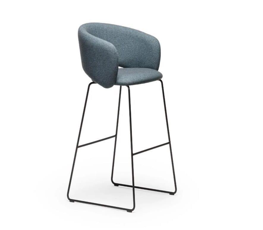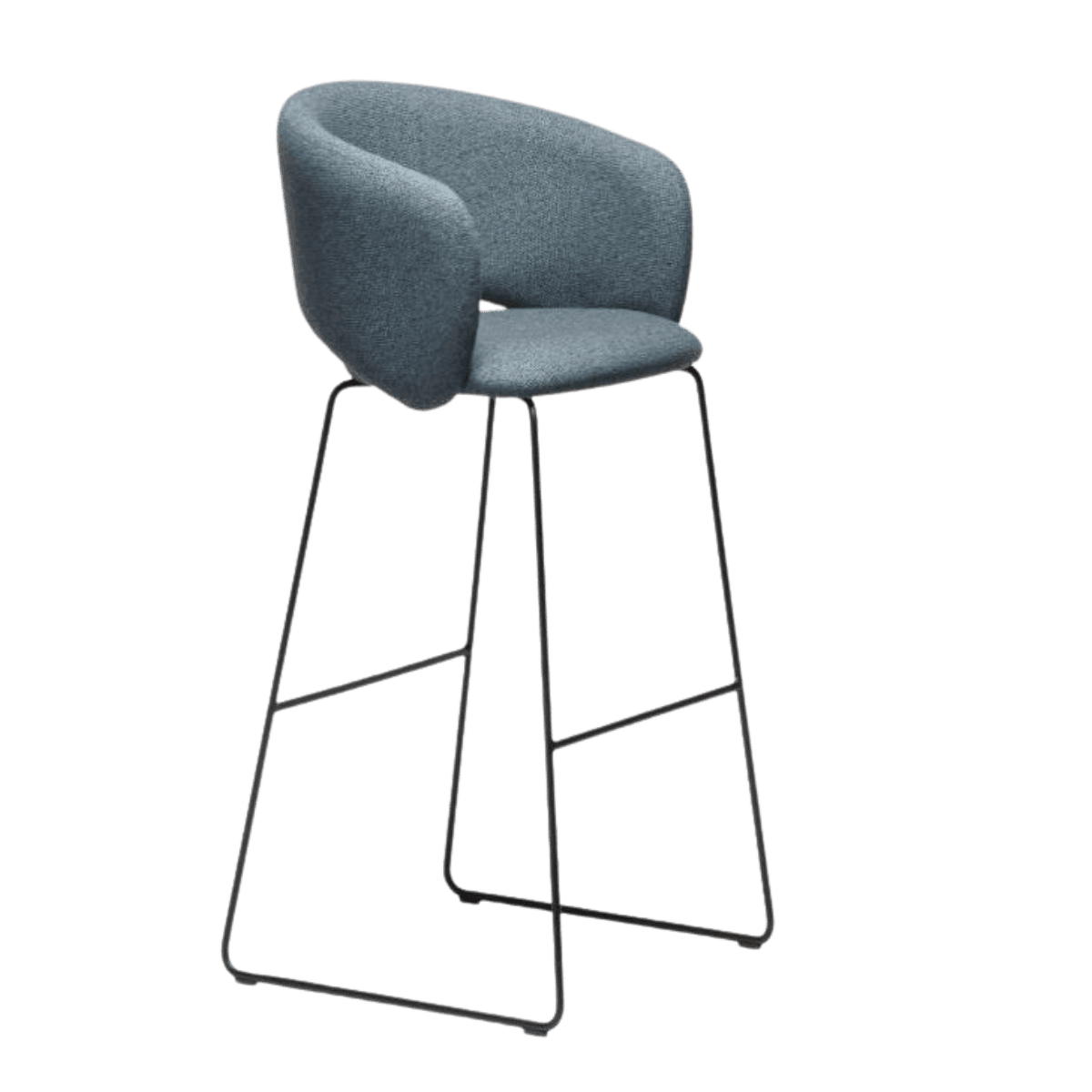 Tapecirana barska stolica s metalnom konstrukcijom, prilagodljiva izborom boja i materijala, idealna za ugostiteljstvo i dom.