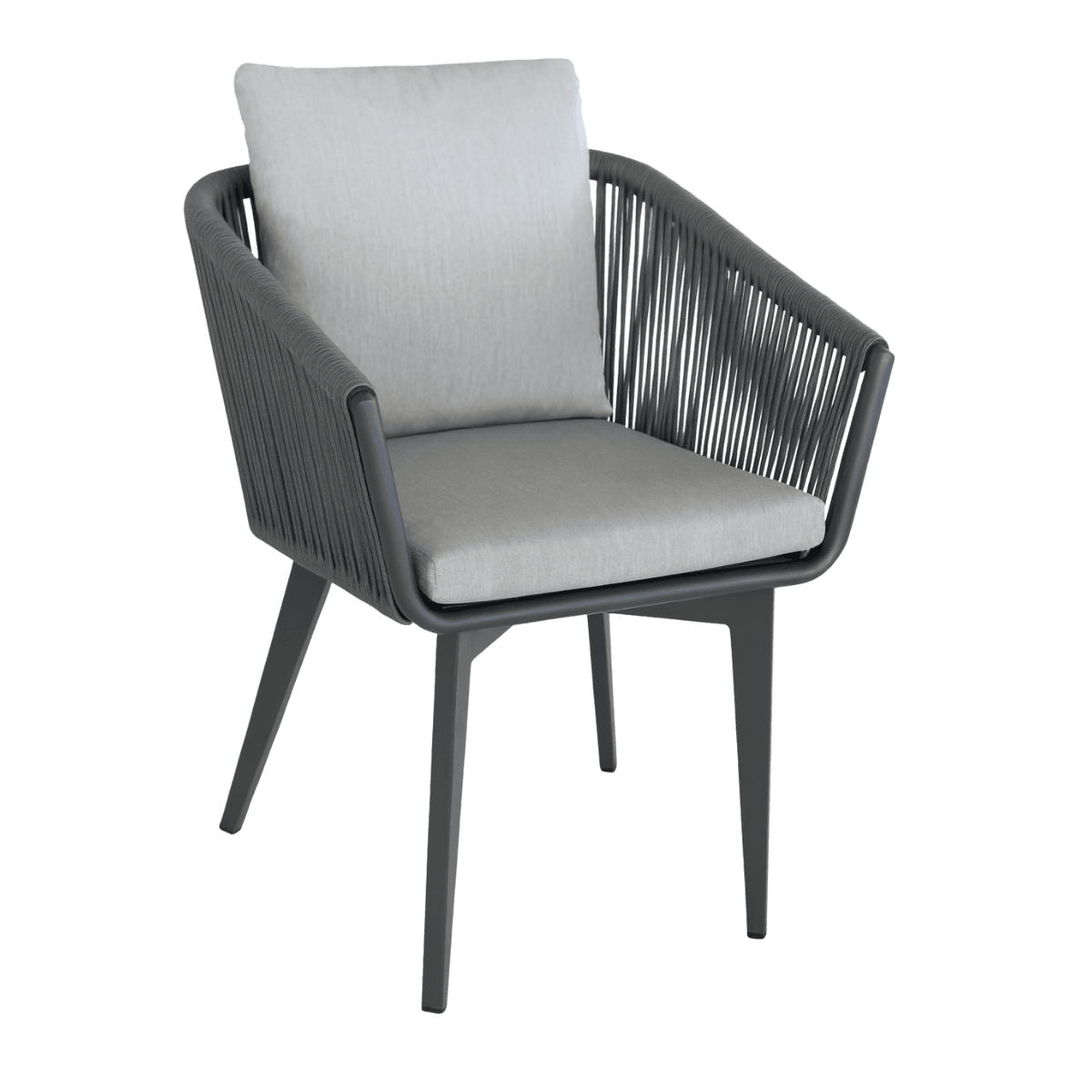 KN Lady je moderna vanjska stolica s aluminijskom konstrukcijom u antracit boji, dizajnirana za suvremene terase i ugostiteljske prostore. Naslon i bočne stranice isprepleteni su sintetičkim konopcem u antracit nijansi, što osigurava vizualnu lakoću i otpornost na vanjske uvjete. Sjedište je opremljeno jastukom od poliesterske tkanine u sivoj boji, koji pruža dodatnu udobnost pri svakodnevnoj uporabi. Stolica je idealna za kombiniranje s različitim stilovima vanjskog namještaja.