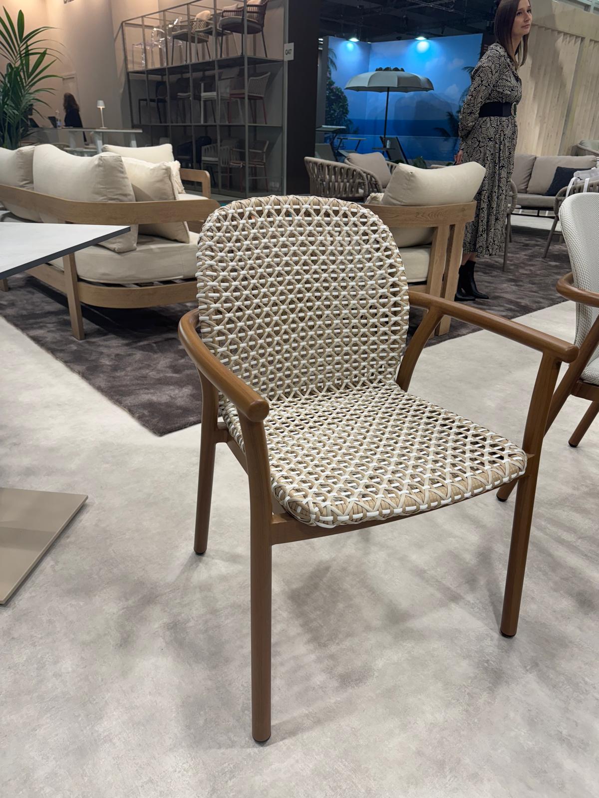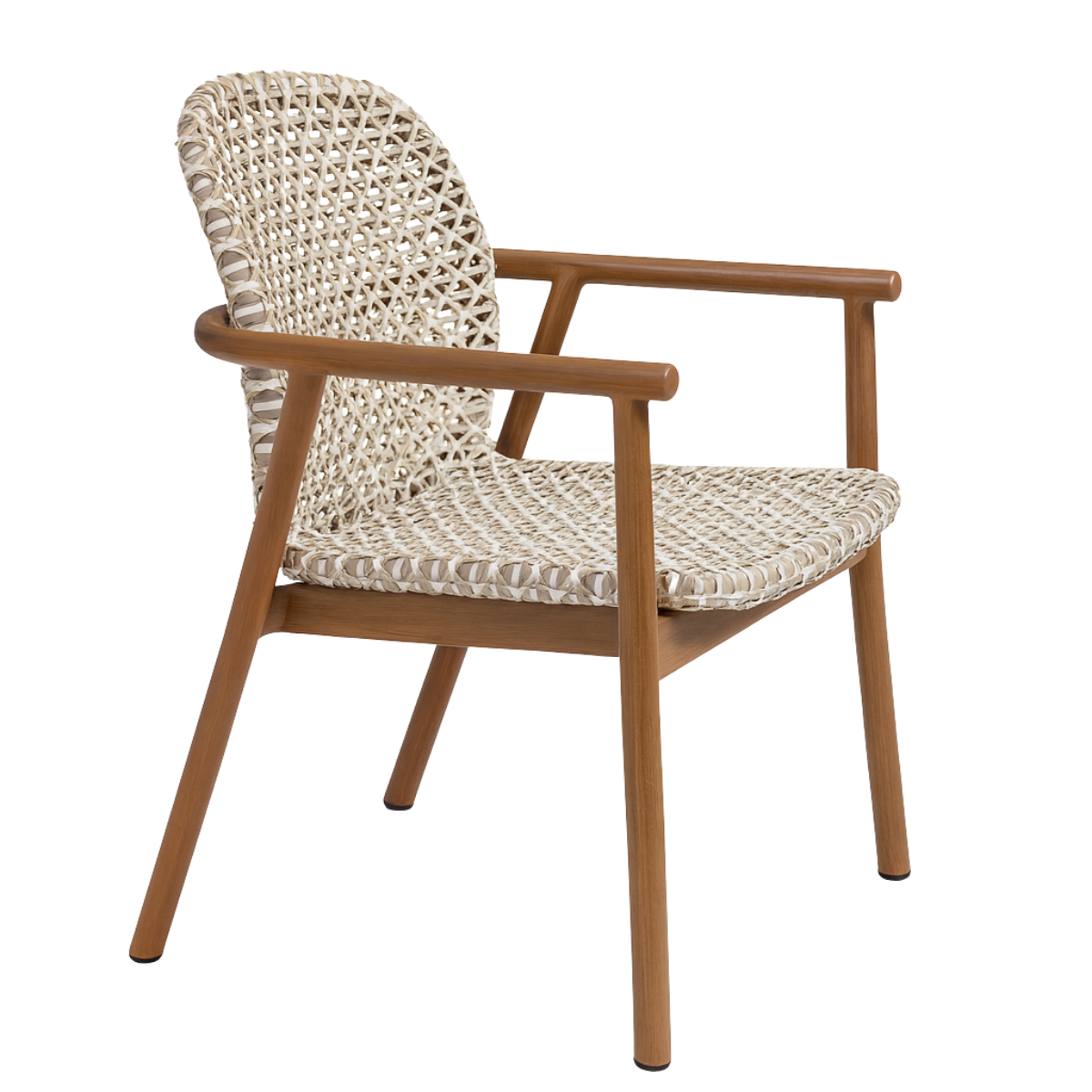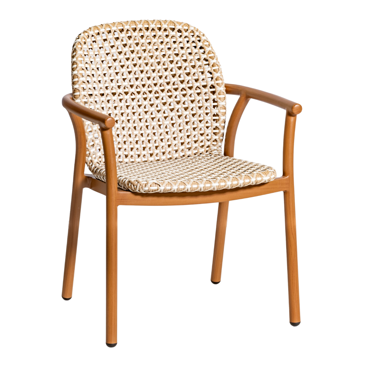 KN Lilie teak je elegantna stolica s rukonaslonima koja spaja toplinu drvenog izgleda i profinjeni pleteni uzorak naslona i sjedišta. Zaobljene linije konstrukcije daju joj mekoću i vizualnu lakoću, dok pleteni detalji unose dozu klasičnog šarma.