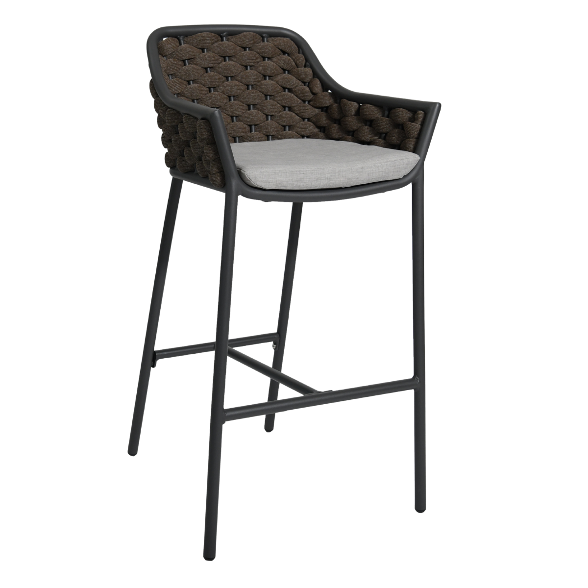 Barska stolica KN Rio bar izrađena je s aluminijskom konstrukcijom u taupe boji, opletenom tekstilen trakama. Sjedište je opremljeno jastukom od tekstilena, otpornog i pogodnog za vanjsku uporabu.