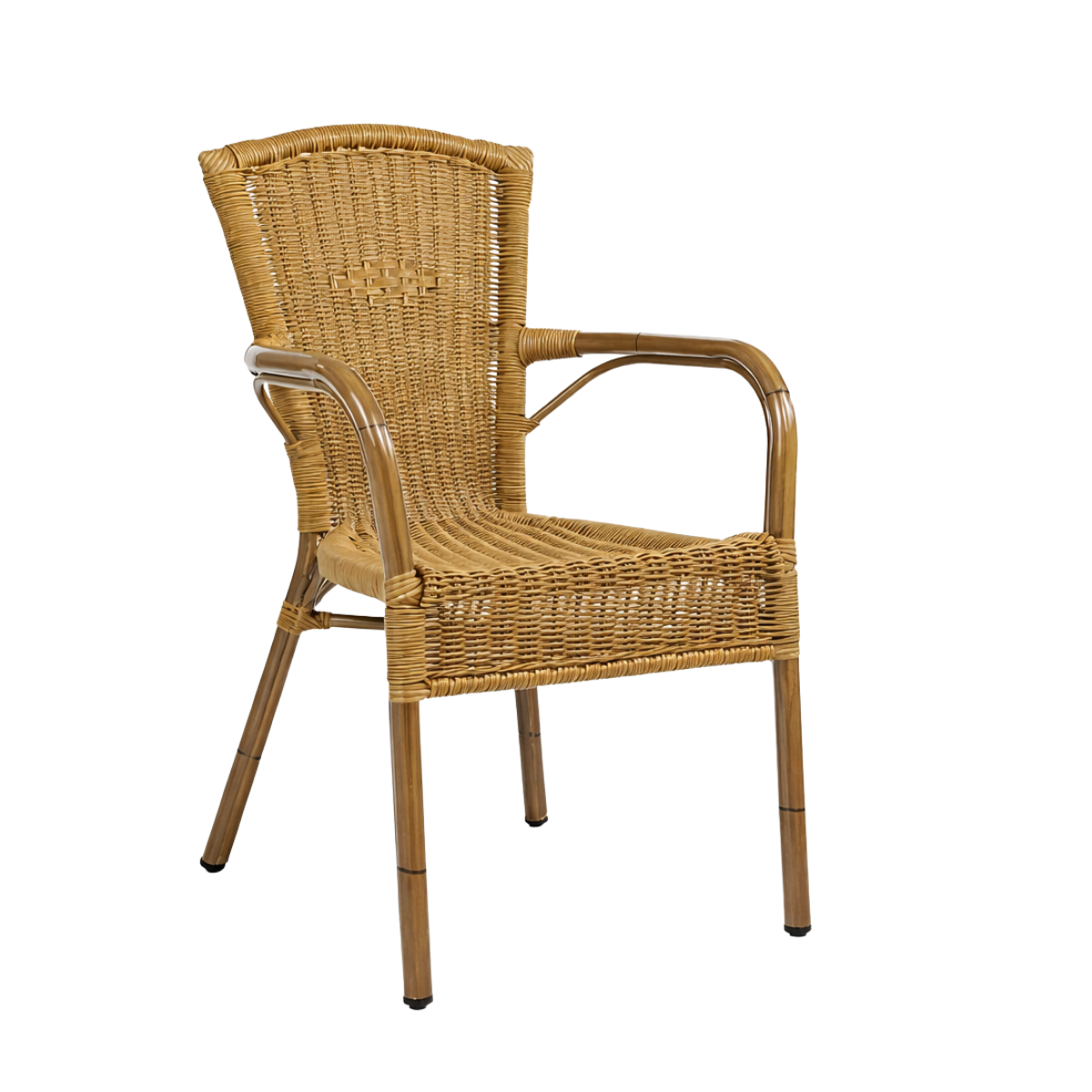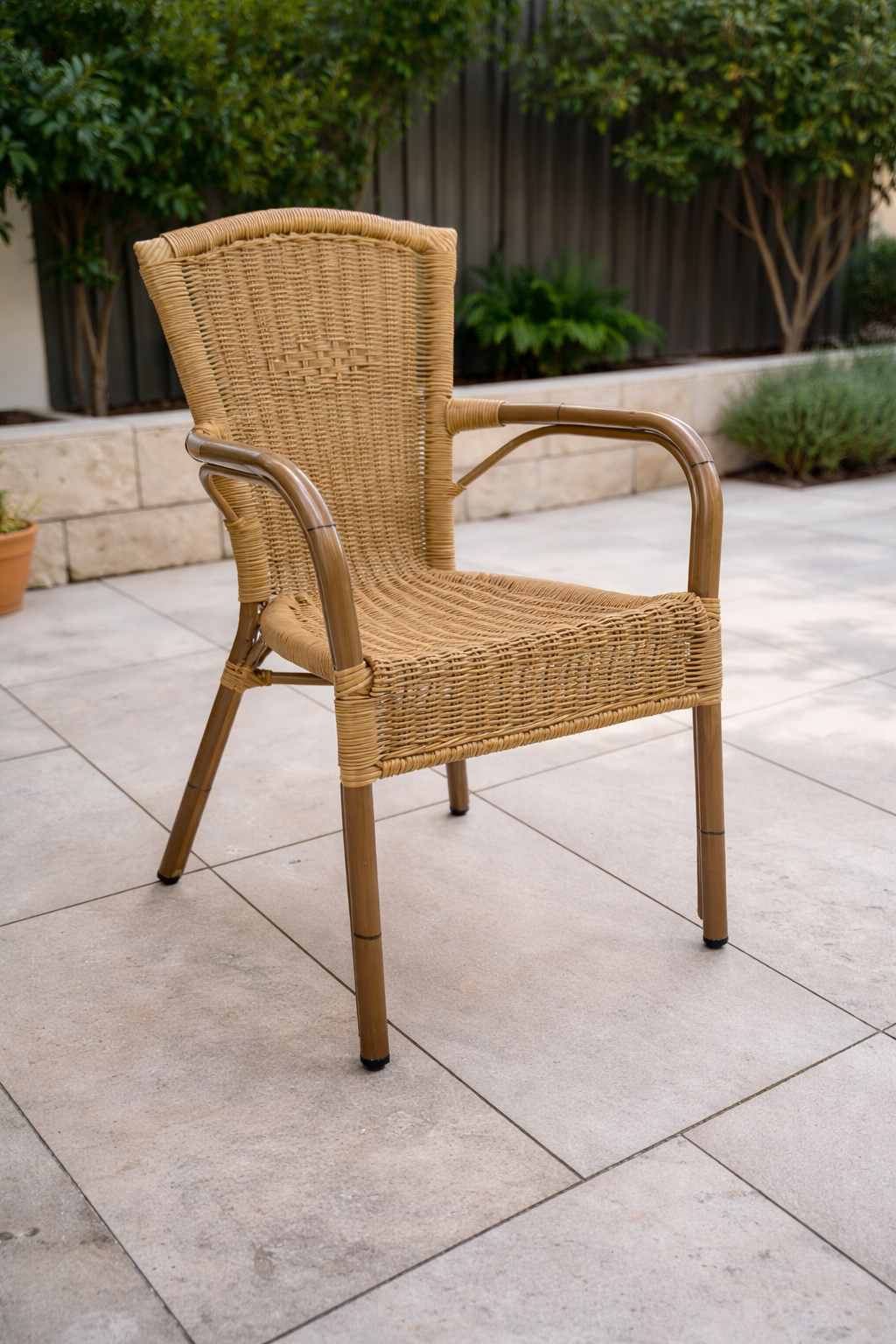 KN Royal 1 med je stolica s aluminijskom konstrukcijom isprepletenom tehno ratanom u bež nijansi. Kombinacija lagane, ali čvrste konstrukcije i dekorativnog pletiva daje joj elegantan izgled, pogodan za terase, vrtove i ugostiteljske prostore.