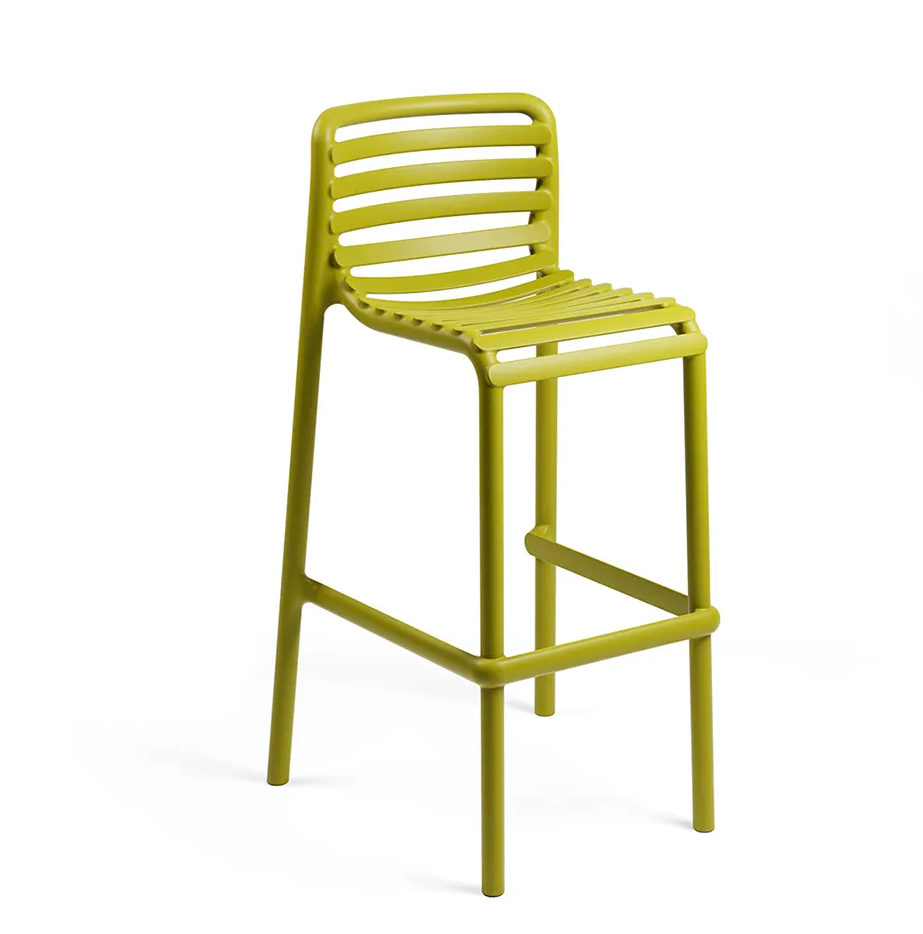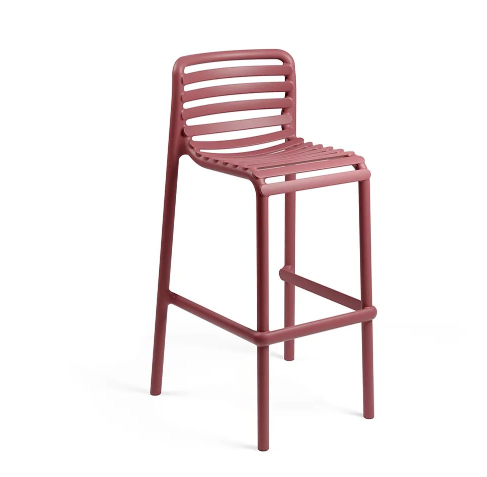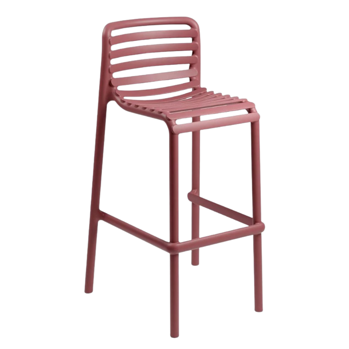 Lagana vanjska barska stolica letvičastog dizajna s ergonomskim S oblikom sjedala, izrađena od reciklabilnog polipropilena ojačanog staklenim vlaknima.