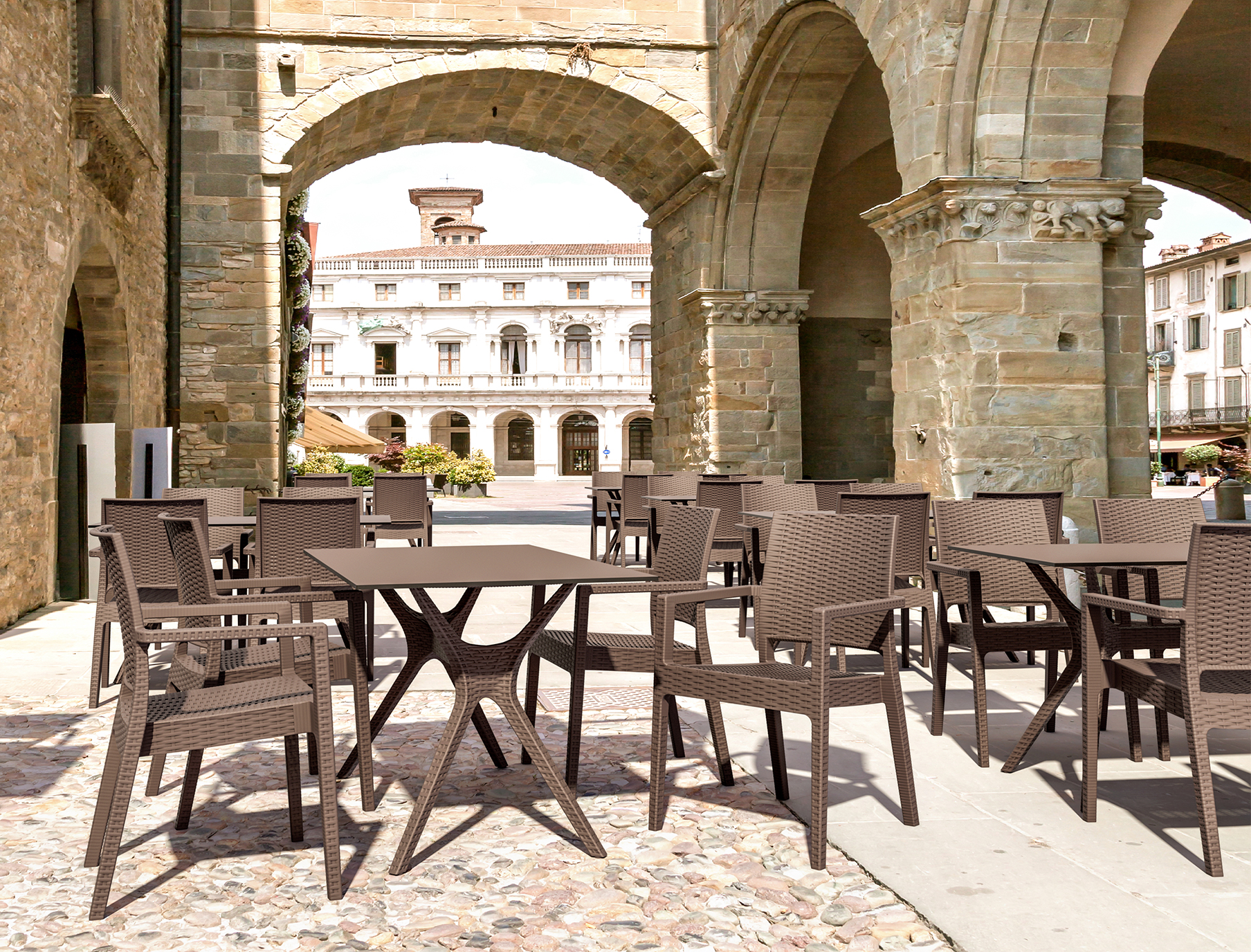 Materijal je UV zaštićen, što osigurava postojanost boje i otpornost na snažno sunce. Zahvaljujući čvrstoj, ali laganoj izvedbi, model je prikladan za intenzivnu upotrebu u ugostiteljskim objektima, na terasama, u vrtovima i zatvorenim prostorima. Mogućnost slaganja omogućuje jednostavno skladištenje i optimizaciju prostora.